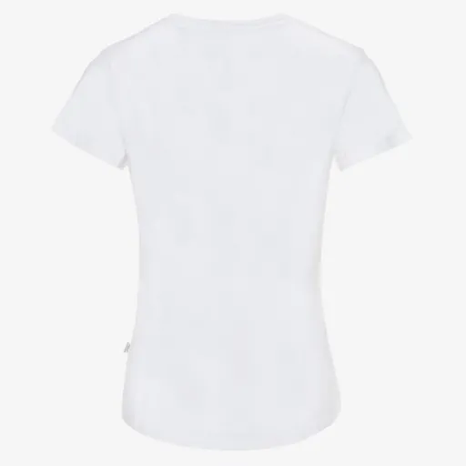 Wit Puma Essentials sport T-shirt voor dames. Voorzien van korte mouwen en een hoge, ronde hals. Het T-shirt heeft zwarte merkopdrukken aan de voorzijde en is gemaakt van 100% katoen.ΒΆΒΆ