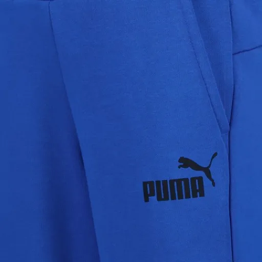 Blauwe Puma Essentials joggingbroek voor kinderen. Voorzien van een elastische tailleband met aantrekkoordjes en twee steekzakken. De joggingbroek heeft een regular fit pasvorm en elastiek in de broekspijpen. Voorzien van witte merkaccenten op het bovenbeen. De joggingbroek is gemaakt van 66% katoen en 34% polyester.