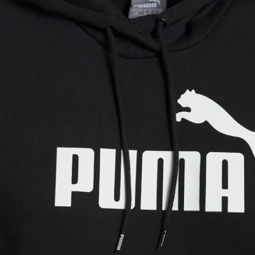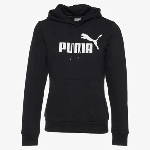 Zwarte Puma Essentials Logo hoodie voor dames. Voorzien van een capuchon met aantrekkoordjes en een buidelzak aan de voorzijde. De sweater heeft een witte merkopdruk op de borst en is gemaakt van 68% katoen en 32% polyester.