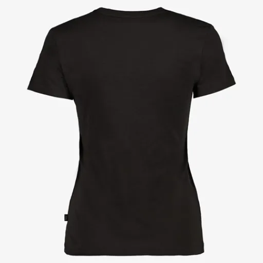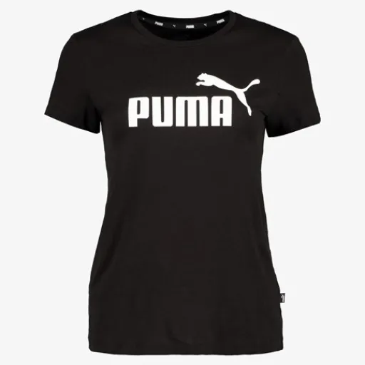 Zwart Puma Essentials Logo dames sport T-shirt. Voorzien van een ronde hals en korte mouwen. Het shirt heeft een witte merkopdruk en is gemaakt van 100% katoen.
