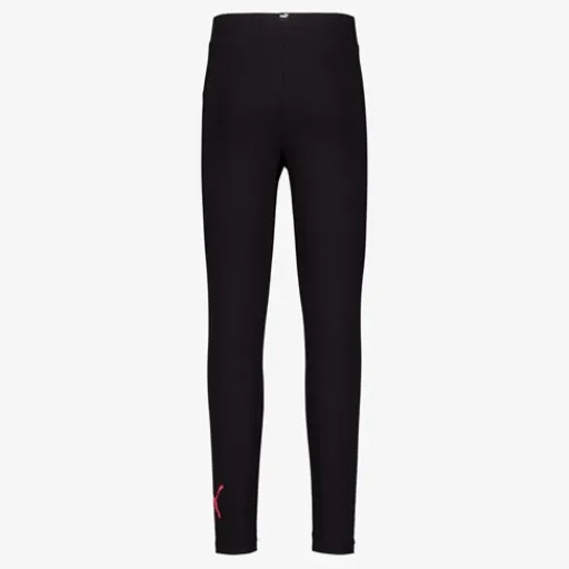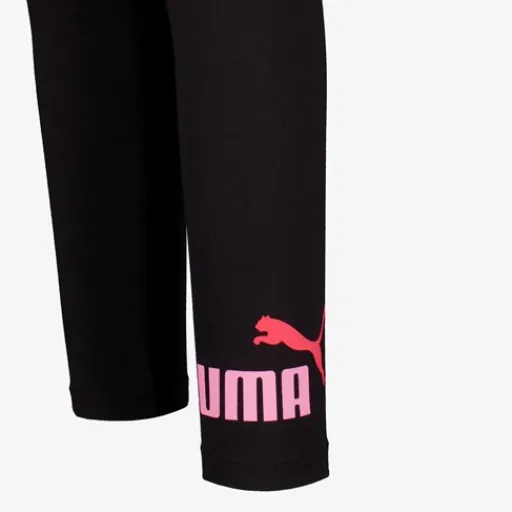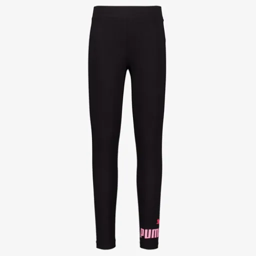 Zwarte Puma Essentials Logo sportlegging voor meisjes. Voorzien van een elastische tailleband en een slimfit pasvorm. De legging heeft een roze merkopdruk op de enkel en is gemaakt van 95% katoen en 5% elastaan.
