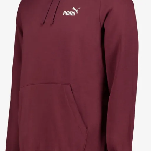 Rode Puma Essentials Small Logo hoodie voor heren. Voorzien van een capuchon met aantrekkoordjes en een buidelzak aan de voorzijde. de hoodie heeft een kleine merkopdruk pp de borst en is gemaakt van 100% katoen.
