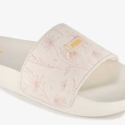 Witte Puma Leadcat 2.0 Crafted Flowers badslippers voor dames. Voorzien van een suede band met bloemenborduursel en een comfortabel voetbed. De badslippers hebben een voorgevormde EVA-zool voor grip en duurzaamheid.ΒΆ