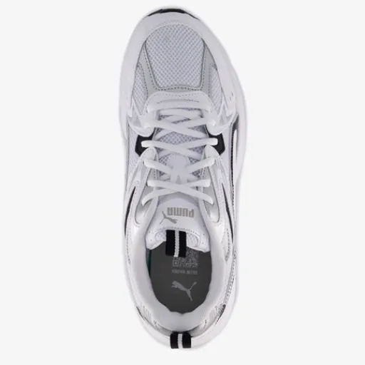Witte Puma Milenio Tech sneakers voor heren. Het buitenwerk is gemaakt van mesh en imitatieleer, het binnenwerk van textiel en de stevige zool met profiel is van rubber. Voorzien van een vetersluiting en aantreklusjes op de hak en tong. Het buitenwerk van de Puma Milenio Tech sneakers wordt versierd zwarte en zilverkleurige details. Binnenzool is niet uitneembaar.