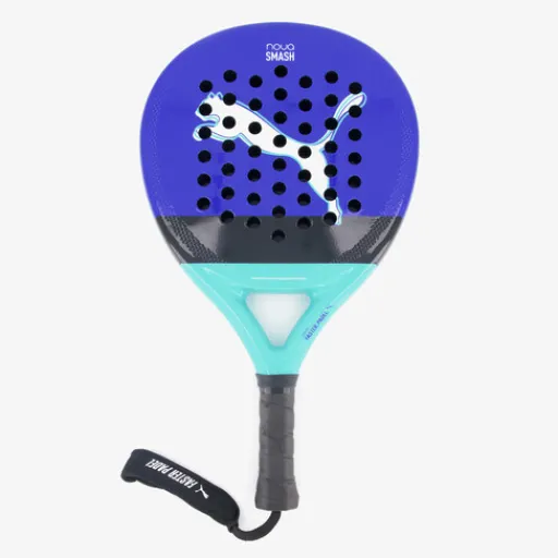 Blauwe Puma Nova Padel Smash padel racket. De racket heeft ronde vorm waardoor die geschikt is voor kinderen en beginners. Het frame van de racket is gemaakt van 100% glasvezelstof. Dit maakt de racket sterk, licht en duurzaam. De kern is gemaakt van EVA-schuim en zorgt voor een uitstekende balcontrole. De racket is voorzien van een gevlochten gripkoord zonder neopreen boord die optimale comfort en grip biedt. Shore-hardheid: 37-38 voor een uitstekende schokabsorptie.