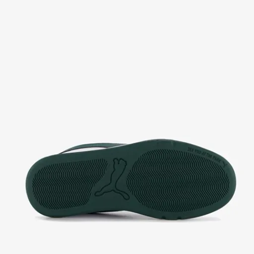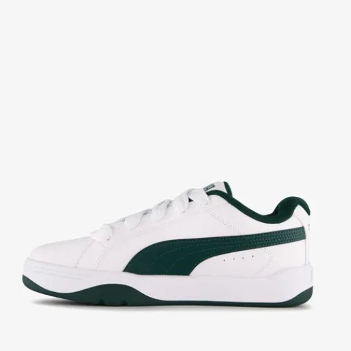 Witte Puma Park Lifestyle Easy jongens sneakers. Het buitenwerk is gemaakt van imitatieleer, het binnenwerk van textiel en de stevige zool met profiel is van rubber. Voorzien van een vetersluiting en een comfortabele binnenzool van textiel. Deze is niet uitneembaar. De Puma Park Lifestyle Easy sneakers hebben groene accenten en groene Puma Formstrips aan de zijkanten.