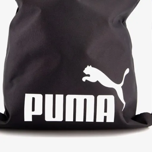 Zwarte Puma rugzak. Voorzien een wit merkopdruk op de voorkant. De tas heeft touwtjes zodat die op de rug te dragen is. Gemaakt van polyester. Afmetingen: 37,5 x 43 cm. Liter inhoud is 6.