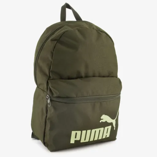 Olijfgroene Puma Phase rugzak met een goudkleurige merkopdruk op het voorvakje. Voorzien van een stevige draaglus en verstelbare, gewatteerde schouderbanden. De tas heeft een ruime hoofdvak met een dubbele ritssluiting, een voorvak met rits en een mesh vakje aan de zijkant waar je een drinkfles in kwijt kan. Afmetingen: 30 x 14 x 44 cm. De inhoud is 22 liter. Gemaakt van polytester.