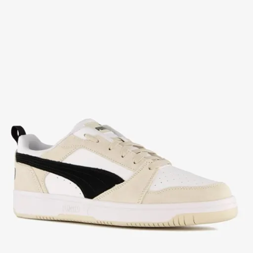 Wit met beige Puma Rebound V6 Low sneakers voor heren. Het buitenwerk is gemaakt van imitatieleer, het binnenwerk van textiel en de stevige zool met profiel is van rubber. Voorzien van een vetersluiting, hiellusjes en een comfortabele binnenzool van textiel. Deze is uitneembaar. Op het bovenwerk van de Puma Rebound V6 Low sneakers zijn perforatiegaten aangebracht en aan de zijkanten zwarte Puma Formstrips.