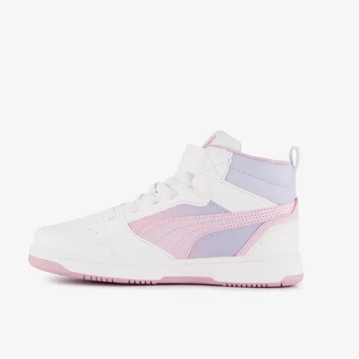 Witte Puma rebound V6 Mid Blurry Dreams AC+ sneakers voor meisjes. Het buitenwerk is gemaakt van imitatieleer, het binnenwerk van textiel end e stevige zool met profiel is van rubber. Voorzien van elastische veters, een klittenbandsluiting en hiellusjes voor een makkelijke instap. Deze hoge meisjes sneakers van Puma worden versierd met pastel roze en pastel paarse accenten. Het comfortabele binnenzool van textiel is niet uitneembaar.