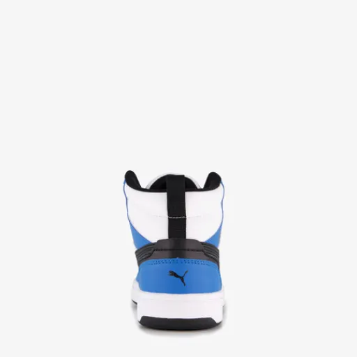 Blauw-witte Puma Rebound V6 Mid sneakers voor jongens. Het buitenwerk is gemaakt van imitatieleer, het binnenwerk van textiel en de stevige zool met profiel is van rubber. Deze hoge sneakers hebben een vetersluiting, hiellusjes en een comfortabele binnenzool met Memory Foam die demping biedt. Voorzien van perforatiegaatjes op het bovenwerk die voor ventilatie en verkoeling zorgen. De sneakers hebben zwarte details en op de zijpanden zijn zwarte Puma Formstrips aangebracht. Binnenzool is niet uitneembaar.