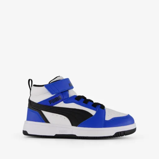Hoge, blauwe Puma Rebound V6 Mid kinder sneakers. Gemaakt van imitatieleer, een binnenwerk van textiel en een rubberen zool. De sneakers hebben elastische veters met klittenbandsluiting voor een makkelijke instap. Het vaste, comfortabele voetbed is gemaakt van textiel en heeft een dempende werking. Voorzien van witte en zwarte accenten.
