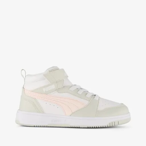 Grijs/witte Puma Rebound V6 Mid sneakers voor meisjes. Het buitenwerk is gemaakt van imitatieleer, het binnenwerk van textiel en de stevige profielzool van rubber. De sneakers hebben perforatiegaten op het buitenwerk en een uitneembaar voetbed met Soft Foam wat voor comfort zorgt. Voorzien van elastische veters met klittenbandsluiting voor een goede pasvorm en een hiellusjes voor een makkelijk instap. Deze mooie sneakers worden versierd met merkopdrukken en roze Puma Formstrips op het buitenwerk.