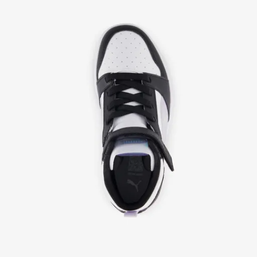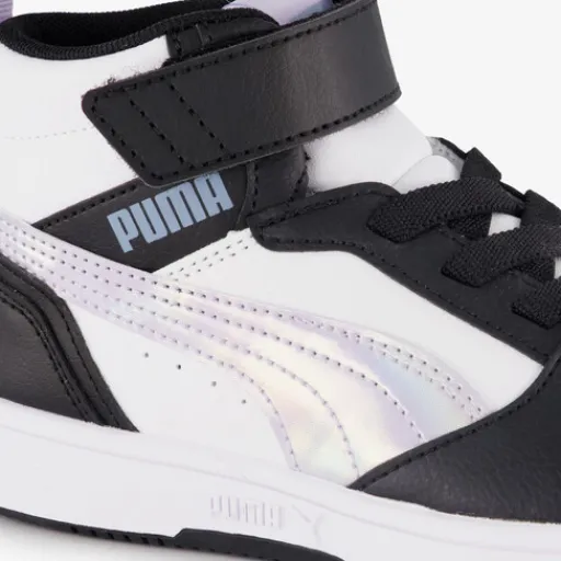 Zwart-witte Puma Rebound V6 Mid Space Belle sneakers voor meisjes. Het buitenwerk is gemaakt van imitatieleer, het binnenwerk van textiel en de stevige zool met profiel is van rubber. Voorzien van elastische veters en een klittenbandsluiting voor een optimale pasvorm en hiellusjes voor een makkelijke instap. Deze hoge sneakers hebben lila Puma Formstrips aan de zijkanten. Het comfortabele voetbed van textiel is niet uitneembaar.