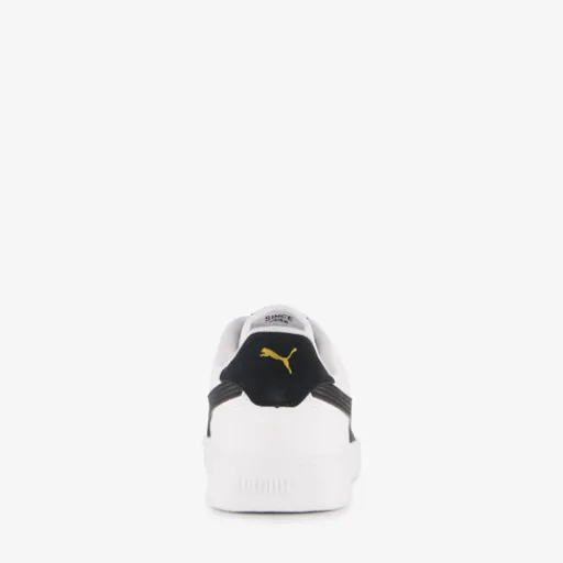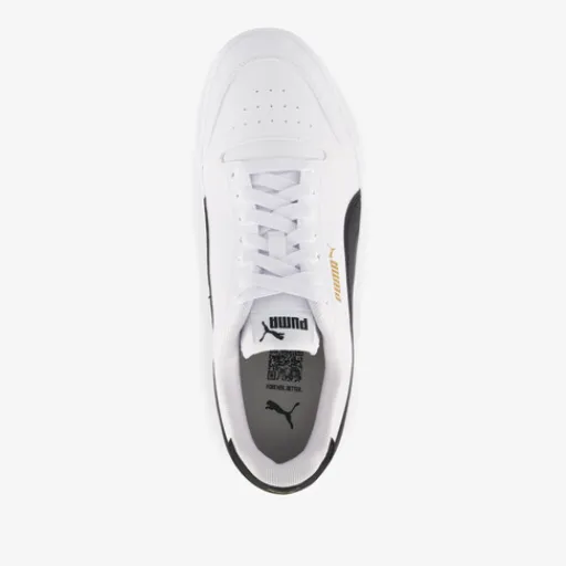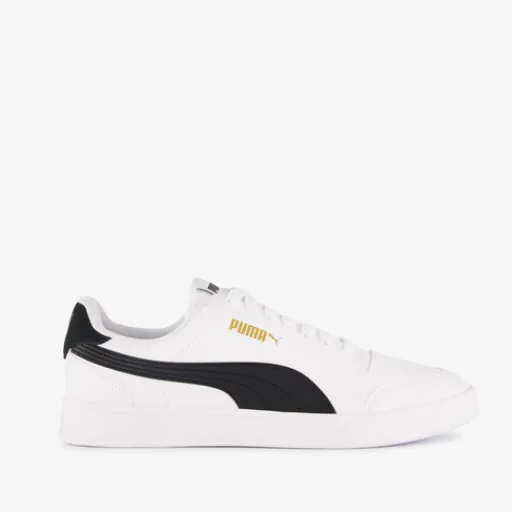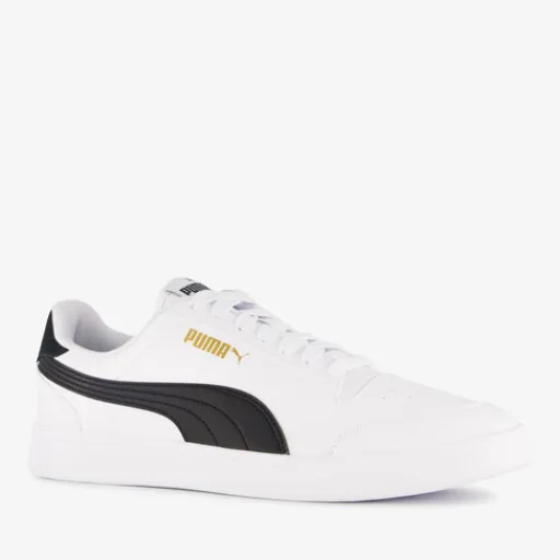 Witte Puma Shuffle sneakers voor heren. Het buitenwerk is gemaakt van imitatieleer, het binnenwerk van textiel en de stevige zool met profiel is van rubber. Voorzien van een vetersluiting en een uitneembare binnenzool met Soft Foam. Deze biedt demping en comfort. Deze gevoerde heren sneakers hebben zwarte details en zwarte Puma Formstrips aan de zijkanten.