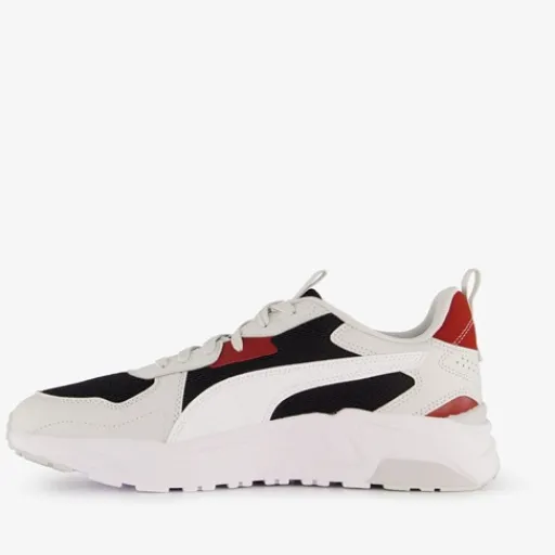 Witte Puma Trinity Lite sneakers met zwarte en rode accenten voor heren. Het bovenwerk is gemaakt van imitatieleer en mesh, het binnenwerk van textiel en de stevige profielzool van rubber. Deze mooie schoenen zijn op hardloopschoenen geïnspireerd en hebben retro-elementen om de stijl te versterken. Voorzien van een SoftFoam+ voetbed voor extra comfort en demping bij elke stap die je neemt. Binnenzool is uitneembaar.
