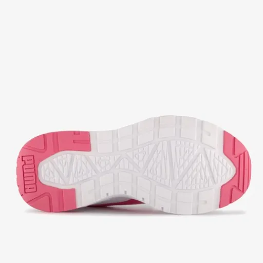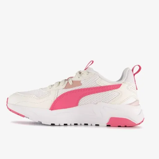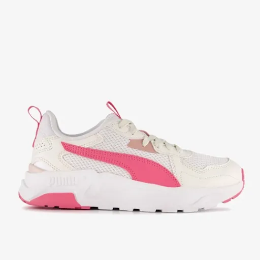 Witte Puma Trinity Lite sneakers met roze details voor meisjes. Het buitenwerk is gemaakt van mesh en heeft roze overlays van imitatieleer, het binnenwerk is van textiel en de stevige profielzool is van rubber. Voorzien van een vetersluiting en aantreklusjes op de hak en tong voor een makkelijke instap. Het comfortabele voetbed van textiel is niet uitneembaar.