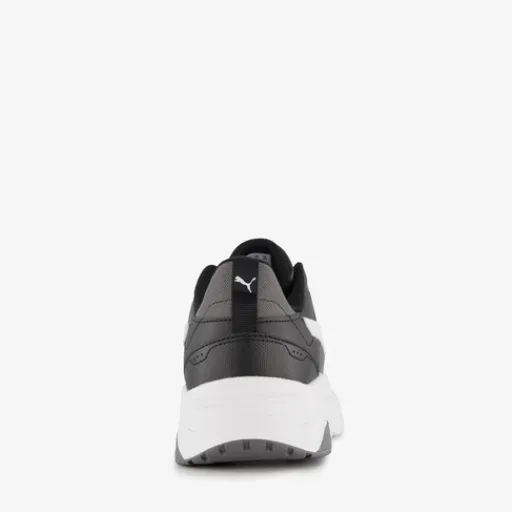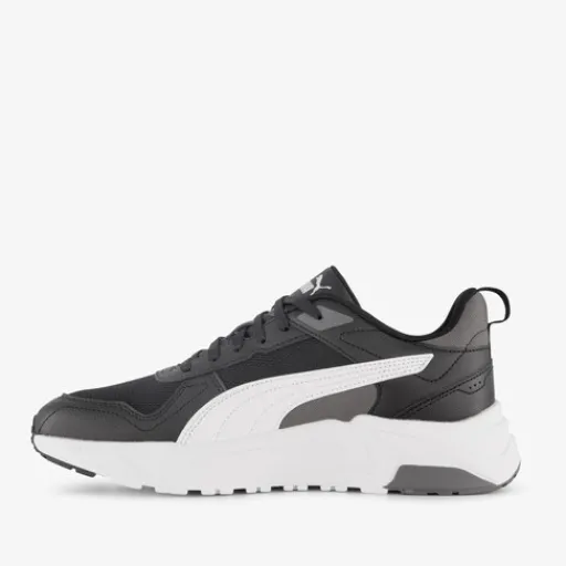 Zwart-witte Puma Trinity 2 LT sneakers voor heren. Het buitenwerk is gemaakt van textiel en imitatieleer, het binnenwerk van textiel en de stevige zool met profiel is van rubber. Voorzien van een vetersluiting, hiellusjes en een uitneembare binnenzool met Soft Foam. Deze biedt demping en comfort. De sneakers hebben een witte buitenzool, grijze accenten en witte Puma Formstrips op de zijpanden.