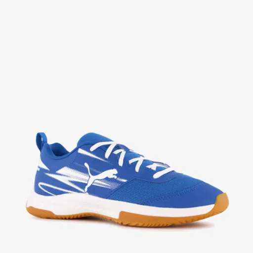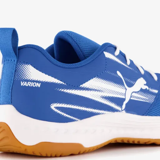 Blauwe Puma Varion II voetbalschoenen voor kinderen. Het ademende buitenwerk is gemaakt van mesh en imitatieleer, het binnenwerk van textiel en de stevige non-marking profielzool van rubber. Voorzien van vetersluiting, hiellusjes en een uitneembaar voetbed van textiel. De zaalschoenen hebben witte PUMA Cat-logo’s op het bovenwerk, witte details en een wit-bruine buitenzool.