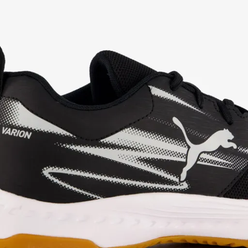 Zwarte Puma Varion II voetbalschoenen voor kinderen. Het ademende buitenwerk is gemaakt van mesh en imitatieleer, het binnenwerk van textiel en de stevige non-marking profielzool van rubber. Voorzien van vetersluiting, hiellusjes en een uitneembaar voetbed van textiel. De zaalschoenen hebben witte PUMA Cat-logo’s op het bovenwerk, witte details en een wit-bruine buitenzool.