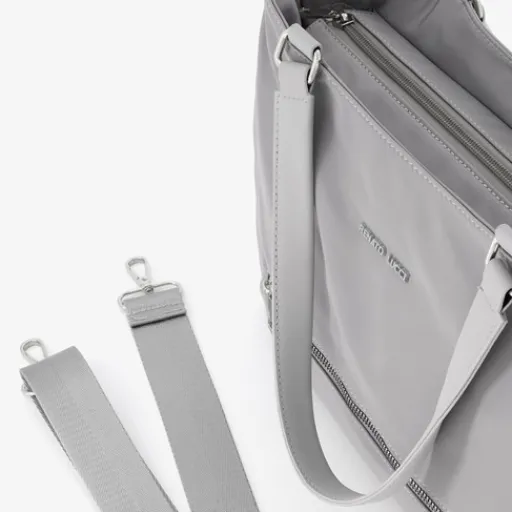 Grijze schoudertas voor dames van Renato Lucci. Voorzien van twee stevige draaglussen aan de bovenzijde en een verstelbare, afneembare schouderband. De tas heeft een ruime hoofvak met meerdere binnenvakjes met ritssluiting en een voor- en achtervak met ritssluiting. De hardware van de tas is zilverkleurige. De tas is gemaakt van nylon. Afmetingen: 36 x 10 x 25 cm.