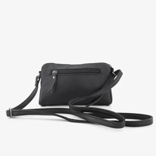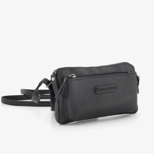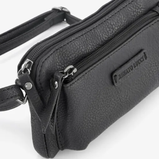Zwarte Renato Lucci schoudertas voor dames. Voorzien van een verstelbare schouderband, een voor- en achtervakje met rits en een hoofdvak met ritssluiting. Afmetingen: 18 x11,5 x 4 cm. Het schoudertasje is gemaakt van imitatieleer.