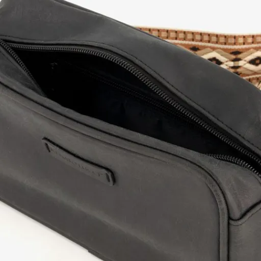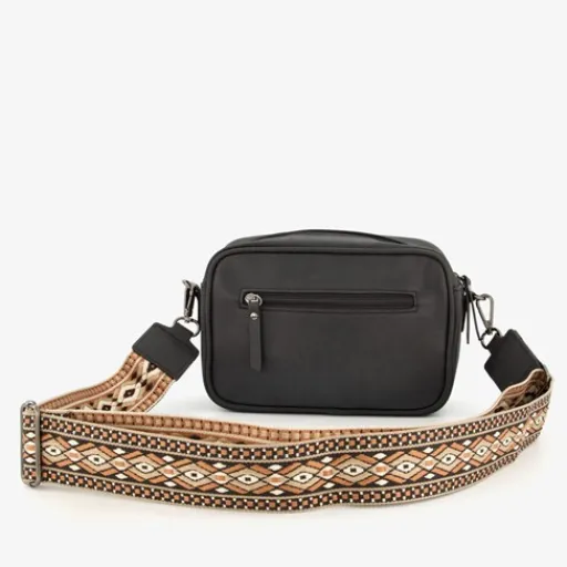 Zwarte crossbody tas voor dames. Voorzien van een verstelbare en afneembare schouderband met grafische print. De tas heeft een achtervakje en een hoofdvak met rits. Gemaakt van imitatieleer. Afmetingen: 20x4x13 cn.