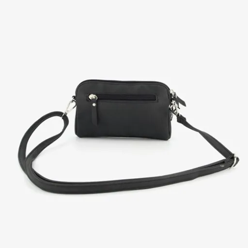 Zwart schoudertasje voor dames van Renato Lucci. Voorzien van een verstelbare schouderband, een voor- en achtervakje met rits en een hoofdvak met ritssluiting. Afmetingen: 18 x11,5 x 4 cm. Gemaakt van imitatieleer.