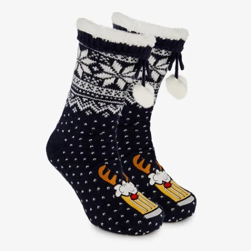 1 paar zachte, warme huissokken voor heren met grappige kerstprint. De huissokken hebben een warme voering en antislip aan de onderzijde zodat je niet uitglijdt. Gemaakt van 75% katoen, 22% polyester en 3% elastaan. ΒΆ