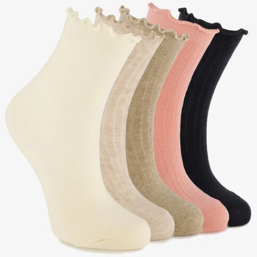 5 paar lange kindersokken met kartelrandjes in de kleuren roze, beige en zwart. Gemaakt van 70% katoen, 28% polyester en 2% elastaan.