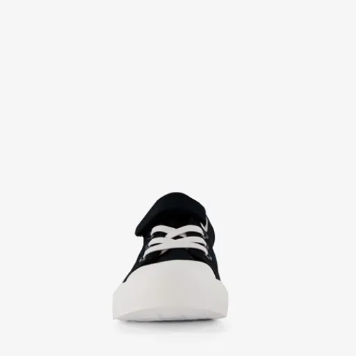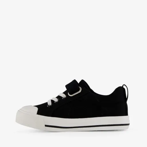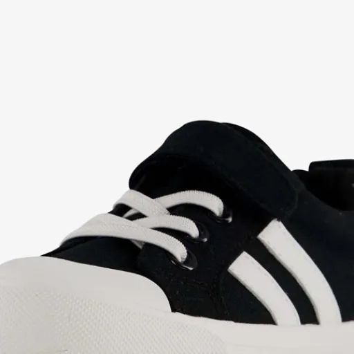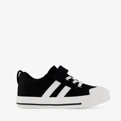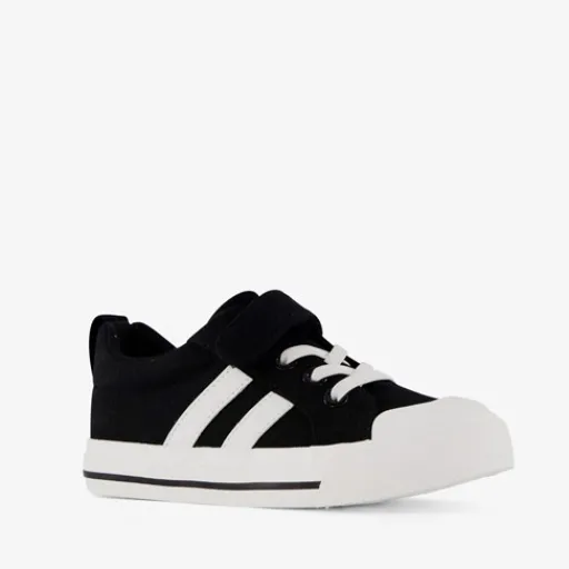 Stoere, zwarte canvas kinder gympen. Gemaakt van textiel, een binnenwerk van textiel en een stevige zool. De gympen hebben een elastische veters, klittenband en een aantreklusje op de hiel. Zo zijn ze extra makkelijk aan- en uit te trekken! De binnenzool van textiel is niet uitneembaar. Voorzien van twee strepen op het buitenwerk en een stevige, witte zool die grip en demping biedt. ¶