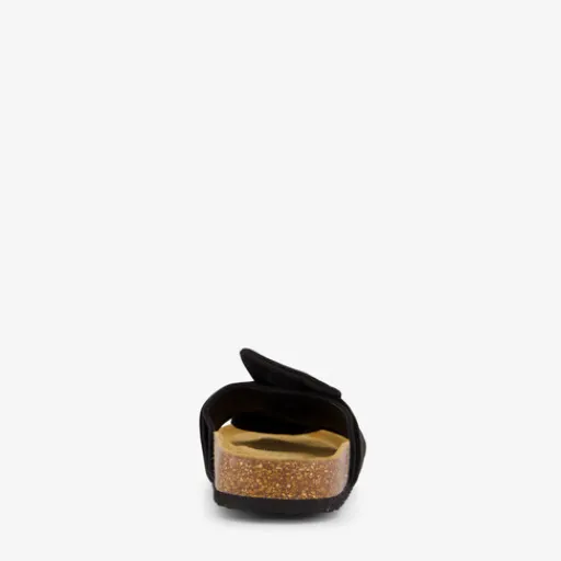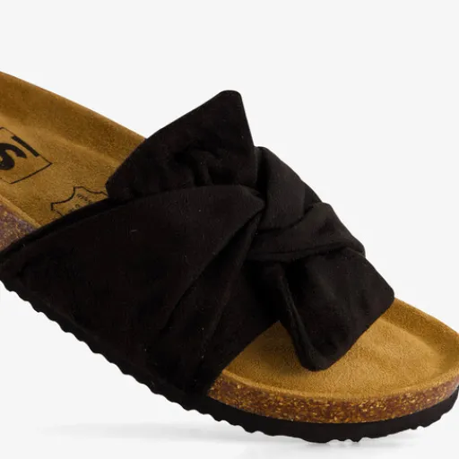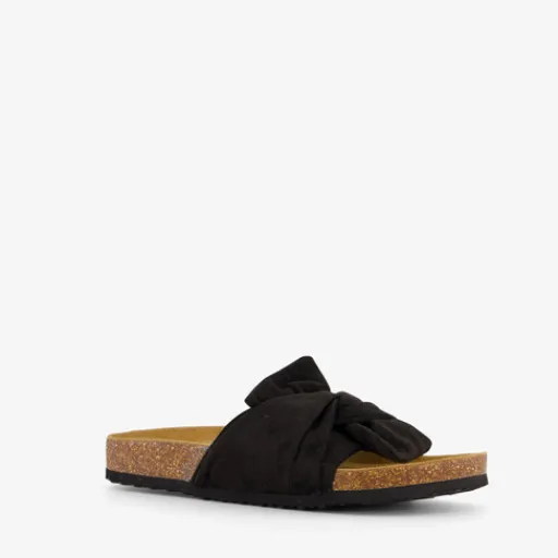 Zwarte bio slippers voor dames. De brede teenband met strik is gemaakt van textiel, het binnenwerk van leer en de stevige profielzool van rubber.
