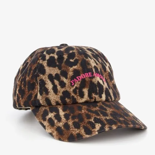 Bruine pet met panterprint en roze tekstopdruk voor dames. Voorzien van een verstelbaar bandje aan de achterzijde en gemaakt van katoen.