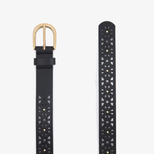 Zwarte riem voor dames met perforaties en subtiele studs. De riem heeft een goudkleurige gesp en is gemaakt van imitatieleer.
