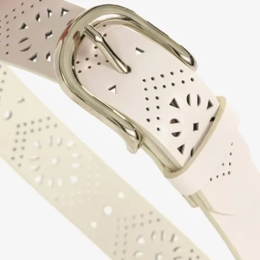 Witte riem voor dames met perforaties. De riem heeft een goudkleurige gesp en is gemaakt van imitatieleer.
