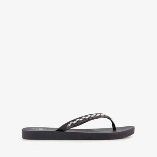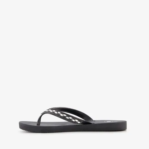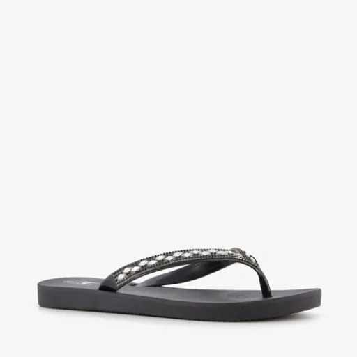 Zwarte teenslippers met strass steentjes voor dames. De slippers hebben een flexibel voetbed en zijn gemaakt van rubber.