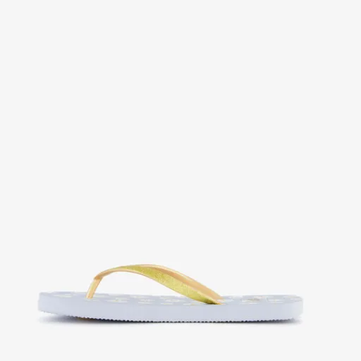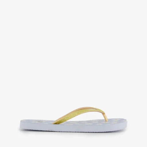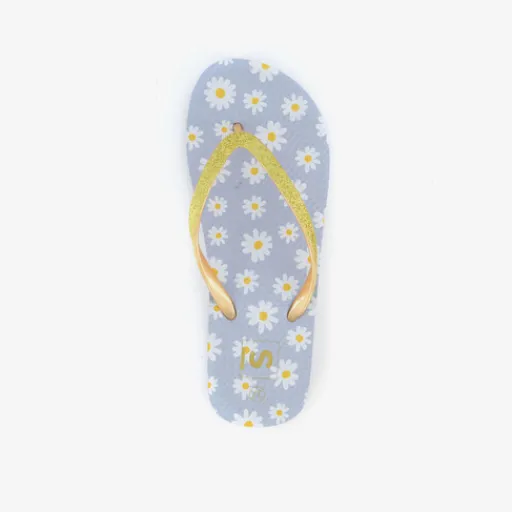 Lichtblauwe dames teenslippers met madeliefjes. De goudkleurige bandjes zijn gemaakt van rubber. Het flexibele voetbed is voorzien van madeliefjes print.