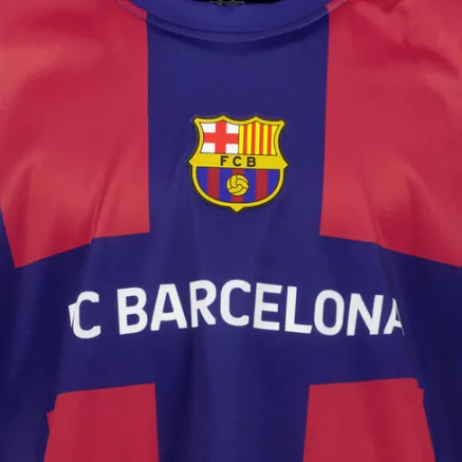 Tweedelig FC Barcelona sport setje voor kinderen. Het rood met blauw shirtje heeft een V-hals en korte mouwen. Het blauwe broekje heeft een elastische tailleband en een comfortabel pasvorm. Het setje is voorzien van de clubnaam en een opdruk op de borst. Gemaakt van 100% polyester.