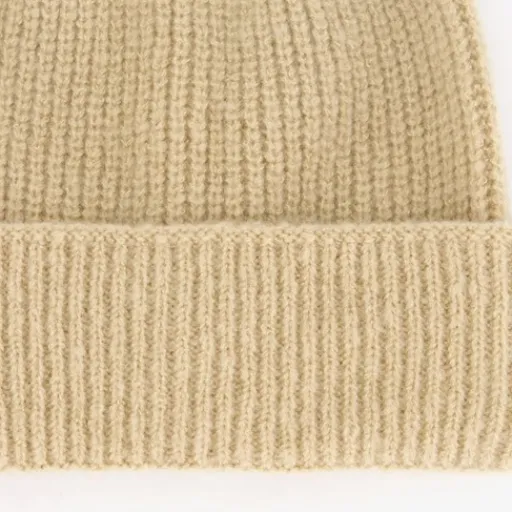 Beige, gebreide muts voor dames. De beanie heeft een omslag en is gemaakt van acryl.