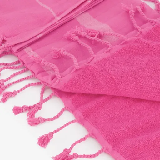 Roze hamamdoek/strandlaken met franjes. De doek is tweezijdige en heeft een gladde kant en een badstof kant. Gemaakt van 70% katoen en 30% polyester. Afmetingen inclusief franjes: 90 x 170 cm.