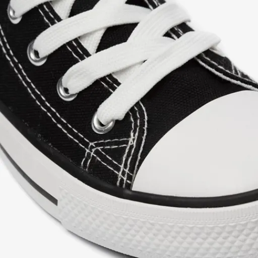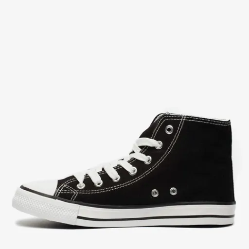 Zwarte, hoge canvas gympen voor dames. Gemaakt van textiel met een binnenwerk van textiel en een stevige zool van rubber. Voorzien van een vetersluiting voor een goede pasvorm. Binnenzool is niet uitneembaar. Deze gave sneakers zijn tijdloos en lekker veelzijdig!