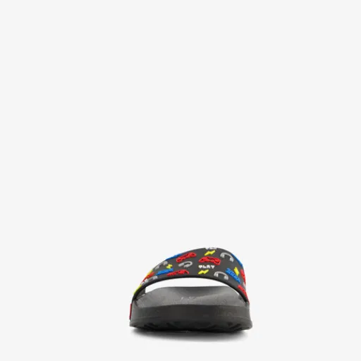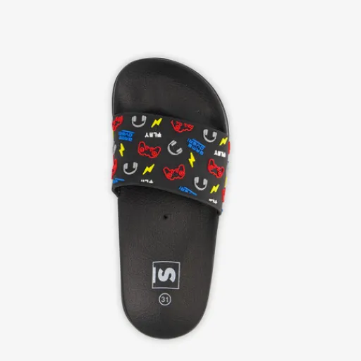 Zwarte badslippers voor jongens. Gemaakt van imitatieleer met een stevige profielzool. De slippers hebben een brede band bij de tenen met game opdrukken in verschillende kleuren.