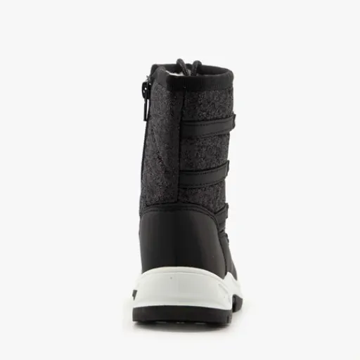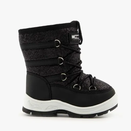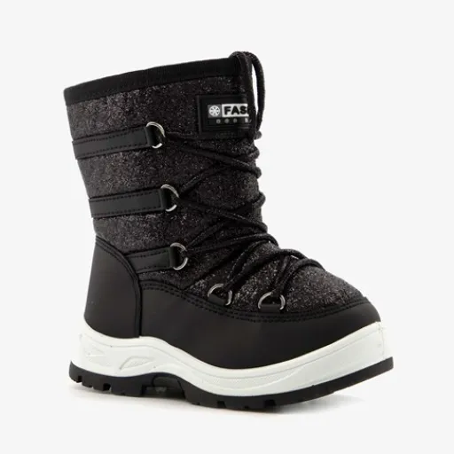 Zwarte snowboots voor kids uit de Scapino collectie. Gemaakt van imitatieleer en kunststof, een binnenwerk van textiel en een stevige profielzool. De snowboots hebben een ritssluiting aan de binnenzijde voor een makkelijke instap. De aansnoerkoordjes aan de voorzijde zorgen voor een aansluitende pasvorm en houden kou en wind buiten. Voorzien van een zachte binnenvoering en een glitter dessin op het bovenwerk. De snowboots hebben een dikke buitenzool van rubber die grip en demping biedt.