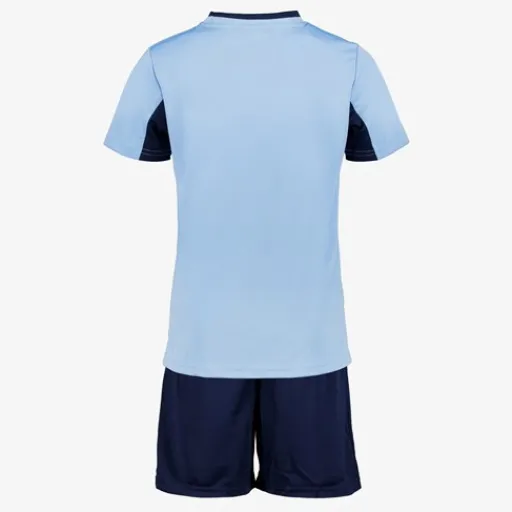 Tweedelige Manchester City FC sport set voor kinderen. Het blauwe heeft een ronde hals, korte mouwen en opdruk van Manchester City met embleem op de borst. Het blauwe broekje heeft een elastische tailleband en het Manchester City embleem op de bovenbeen. Gemaakt van 100% polyester.