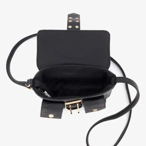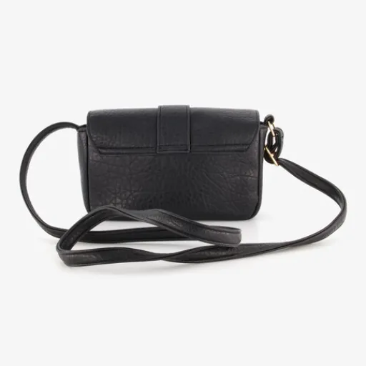 Zwarte schoudertas met goudkleurige hardware voor dames. De tas heeft een verstelbare schouderband, een hoofdvak met gespsluiting en twee handige voorvakjes met klep en drukknopen voor al je kleine essentials. Afmetingen: 20 x 12 x 6 cm. Gemaakt van imitatieleer.