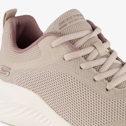 Beige Skechers Bobs Squad Waves sneakers voor dames. Het bovenwerk is gemaakt van mesh, het binnenwerk van textiel en de stevige zool met profiel is van rubber. Voorzien van een vetersluiting en hiellusjes voor een makkelijke instap. Het uitneembare voetbed bevat Memory Foam wat demping en comfort biedt.