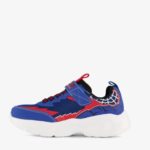 Blauw-rode Skechers Creature-Crawlers sneakers voor jongens. Het buitenwerk is gemaakt van textiel en imitatieleer, het binnenwerk is van textiel en de stevige zool met profiel is van rubber. Voorzien van elastische veters en een klittenbandsluiting voor een optimale pasvorm en aantreklusjes op de hak en tong voor een makkelijke instap. De sneakers hebben opdrukken van een spin en spinnenwebben. Het comfortabele voetbed van textiel is niet uitneembaar.