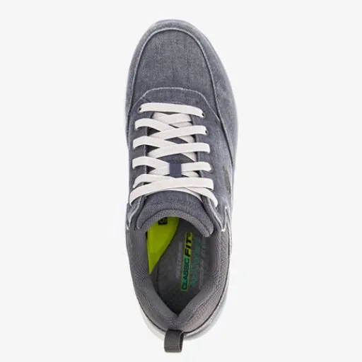 Skechers Delson 2.0 Kemper heren sneakers. Gemaakt van textiel, een binnenwerk van textiel en een stevige en flexibele zool. Het buitenwerk heeft een denim look wat deze sneakers net even wat anders maakt! De binnenzool is voorzien van Air Cooled Memory Foam wat zorgt voor extra comfort tijdens het dragen. Deze zool is niet uitneembaar. De voetholte wordt extra ondersteund dankzij de Skechers Goga Mat®. De sneakers zijn voorzien van vetersluiting en hebben een handig aantreklusje op de hak. De schoenen zijn gemaakt van 100% vegan materialen.