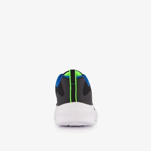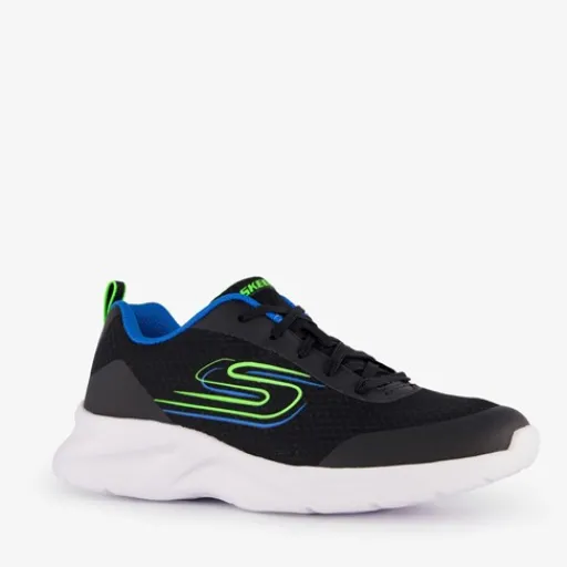 Zwarte Skechers Dynamatic sneakers voor jongens. Het buitenwerk is gemaakt van imitatieleer, het binnenwerk van textiel en de profielzool van rubber. Voorzien van een vetersluiting voor een optimale pasvorm en hiellusjes voor een makkelijke instap. Het comfortabele voetbed van textiel is uitneembaar. De stevige, witte buitenzool biedt grip en demping. Het buitenwerk wordt versierd met groen en blauwe details.