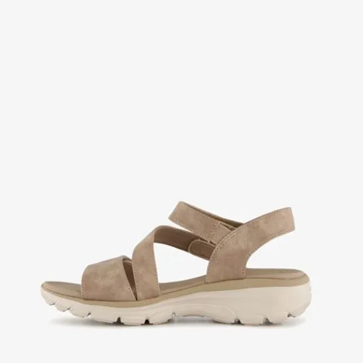 Taupe Skechers Relaxed Fit: Easy Going – All Day Chic dames sandalen. Gemaakt van imitatieleer met een metallic glanzende afwerking, een binnenwerk van textiel en een rubberen zool. De sandalen hebben verstelbare bandjes met klittenband en een Yoga FoamĀ®-voetbed met demping. Voorzien van Relaxed FitĀ® voor een ruime, comfortabele pasvorm bij de tenen en voorvoet. De sandalen hebben een zool van circa 4 cm dik.